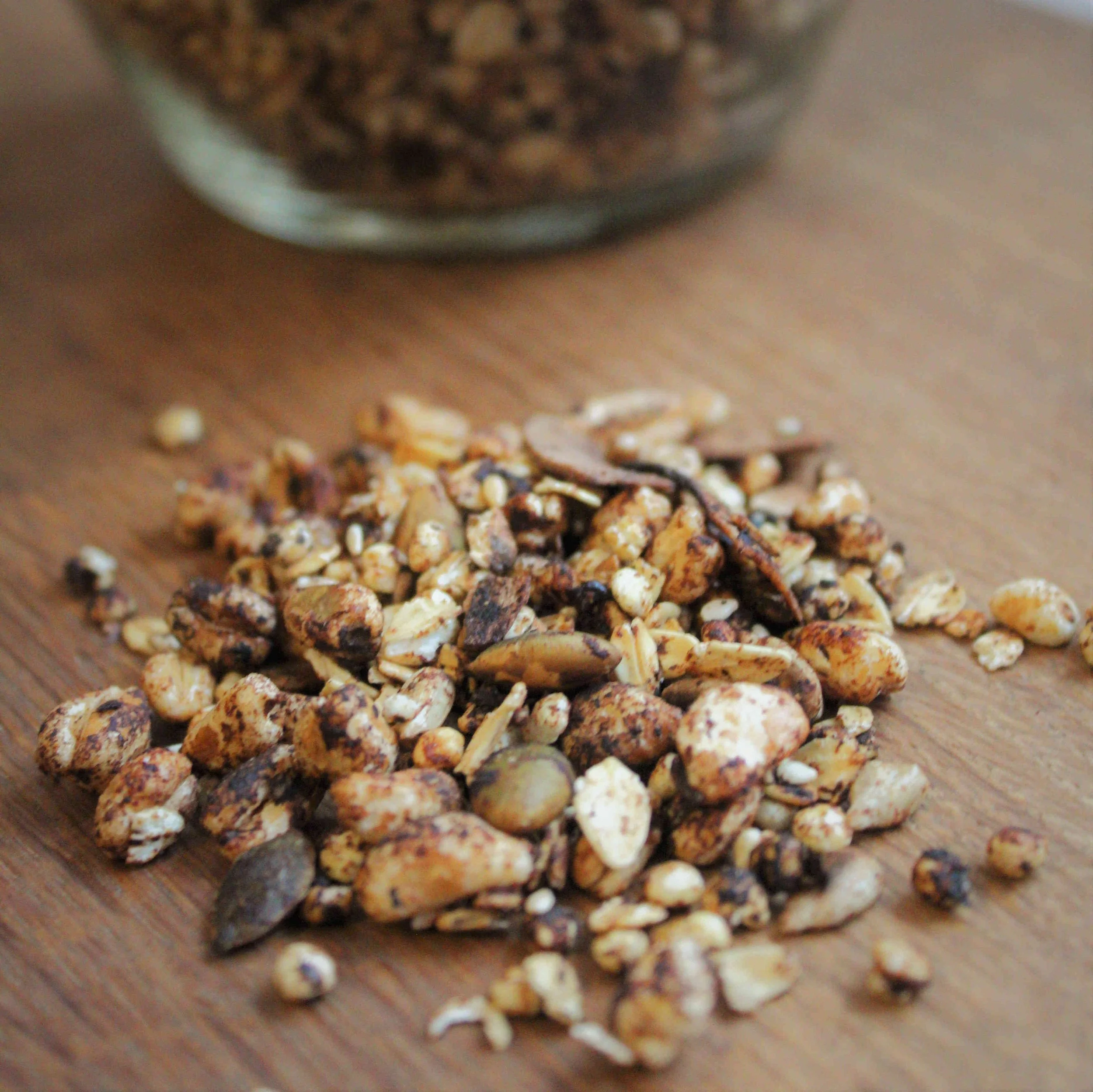 A receita base usa flocos de aveia e espelta, mas podes optar por fazer apenas aveia - para uma versão sem glúten. E os cereais puff, conjugo millet e arroz, mas podes optar por os que mais gostares (ou tiveres na despensa!)